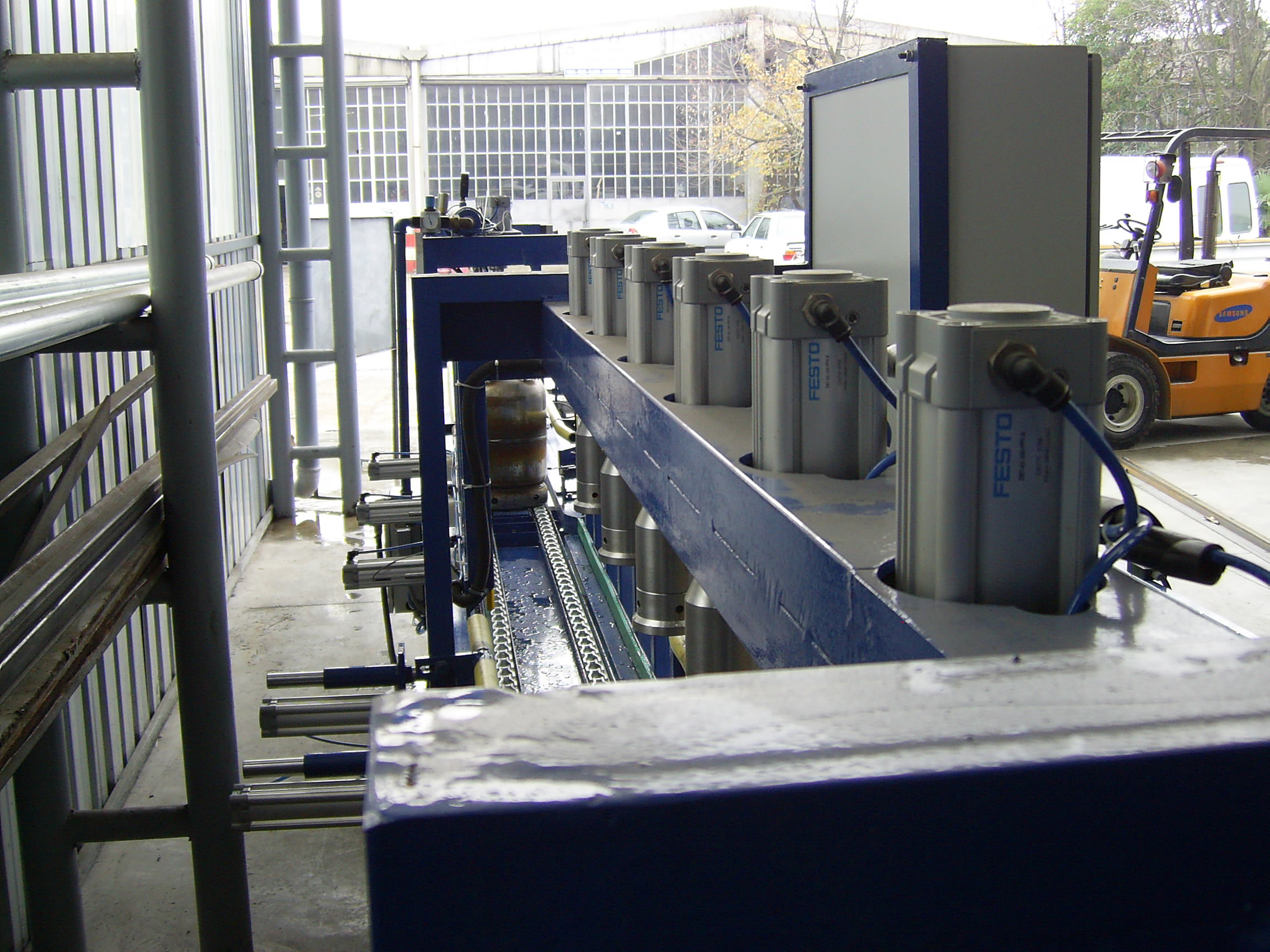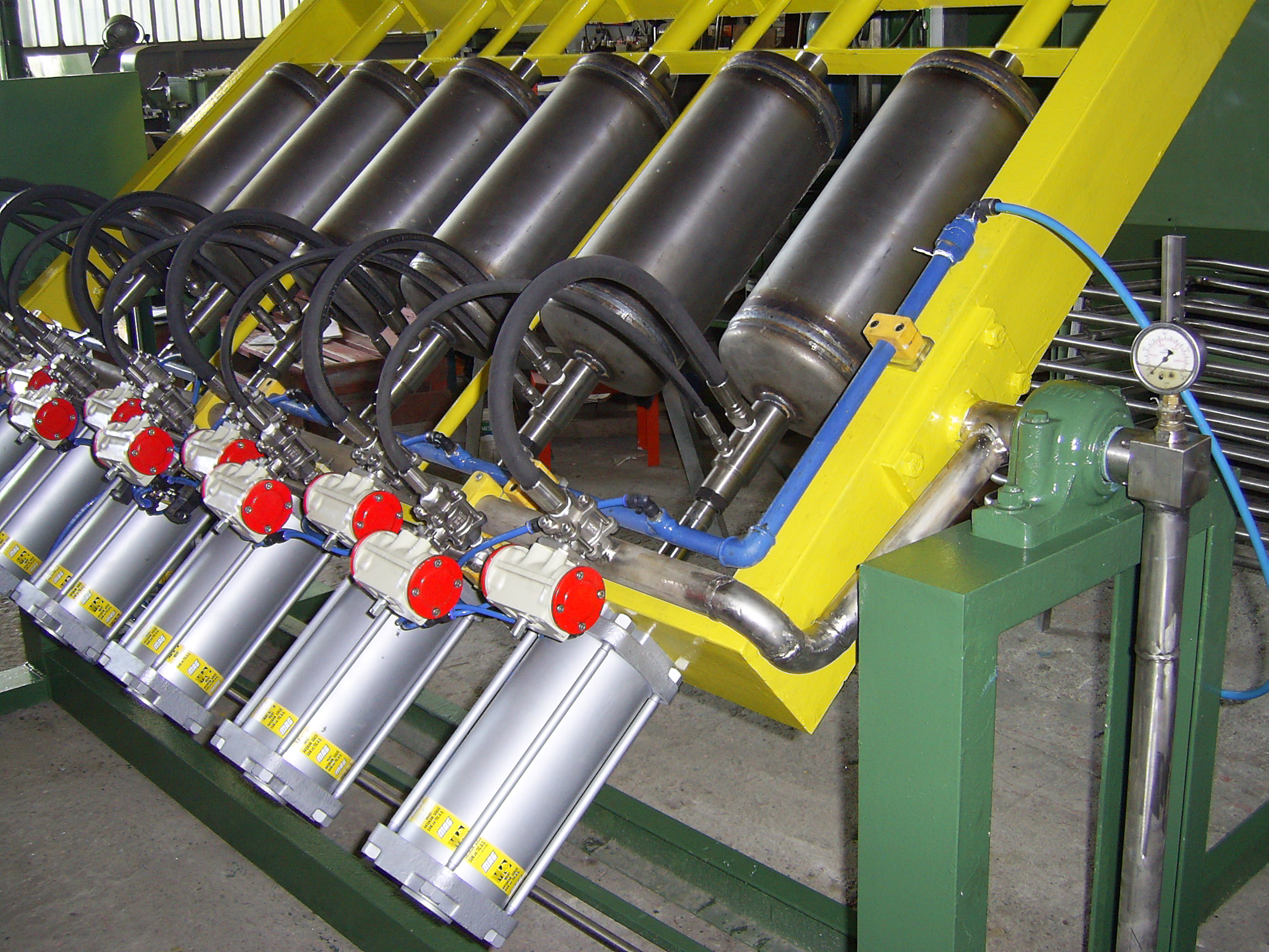 To detect leaks in the welded sections or flange connections of LPG cylinders, the cylinders are submerged in a water-filled tank, with their valve areas positioned near the water's surface. If a leak is present, bubbles will form on the surface. For efficiency, air leak testing machines are often designed to test 5-10 cylinders simultaneously. The cylinders are conveyed into a testing cage, whose entry and exit points are secured with stoppers, and the cylinders are tested in a horizontal orientation.