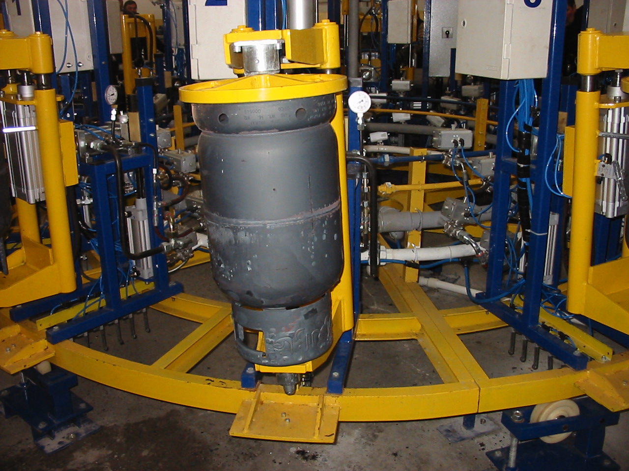 The hydrostatic test carousel automatically loads 300-liter household LPG cylinders, fills them with water, pressurizes them, and checks for leaks; after testing, the cylinders are unloaded and returned to the conveyor, ensuring continuous operation.